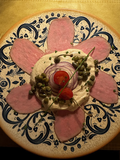 Das Restaurant selbst hat einen ganz besonderen Charme. Die Einrichtung ist schlicht und gleichzeitig gemütlich, was eine perfekte Atmosphäre für ein entspanntes Abendessen schafft. Der Fiat 500 im Inneren ist ein absoluter Blickfang, ein witziges und gleichzeitig stilvolles Detail, das dem Restaurant eine persönliche Note verleiht! PS: Die Discokugel auf dem 500, da könnte man vielleicht noch einmal drüber nachdenken. Sie wirkt für mich ein bisschen deplatziert und passt nicht ganz zum Ambiente. Vielleicht wäre eine schlichtere Dekoration an dieser Stelle besser geeignet.