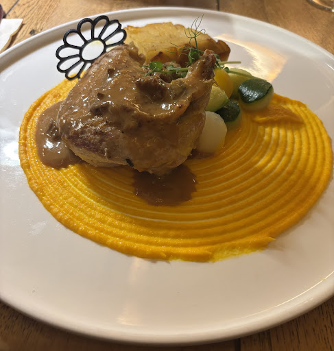 Nous avons commandé un Poulet de Bresse pour deux à 90 CHF. Après nous avoir montré le poulet entier dans sa casserole sur son lit de foin, pommes de terres et légumes, le patron a ramené le plat en cuisine pour servir.Deux assiettes reviennent joliment faits, mais dessus se trouvaient uniquement une petite cuisse et un petit bout de suprême, avec un peu de jus et quelques légumes, dans une cuisson et une dimension très différentes du « poulet original ».