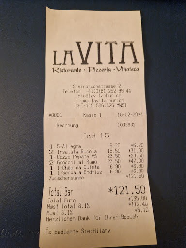 Read moreBRAVO Head Chef and Crew! My intuitive choice for my special dinner with the family at La Vita, turned out to be a perfect choice. The climate of the Ristorante - Vinoteca was elegant, without excess decor, in green colors emphasizing the character of this place. And above all, the rich but not overloaded menu encouraged us to enjoy the dishes served here. The biggest attraction of the evening as CLOU, was the GAMBERONI GRIGLIA, which tempted us with its colors, composition additives and delicious taste, which was a feast for the palate. Taking advantage of the sommelier's advice, we selected from the extensive wine list the one the best harmonised with the dishes and were also moderately priced. The final dessert, Home Made Tiramisu was a perfect complement to our successful family meeting. I'm convised that even if I'm passing through Chur, I will go to the wonderful La Vita and its...
