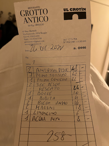 What is truly galling is the owner's temerity of charging 16 (!) CHF for a (small) glass of limoncello! So when you order two you end up at 32 CHF which is absolutely bonkers!