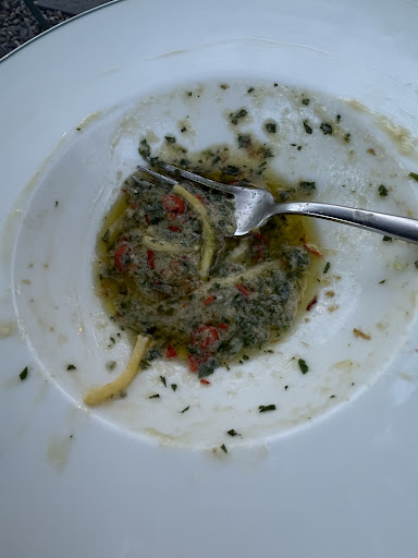 I ordered the spaghetti aglio, olio e peperoncino, but it was swimming in olive oil â truly spoonfuls of it (see photo). My partner had the âsmall chickenâ with grilled vegetables, but the chicken was quite dry and the side dish turned out to be chard, which wasnât mentioned and wasnât to our taste.