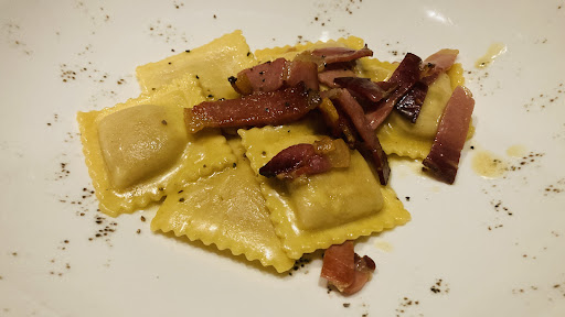 Io con la famiglia ordiniamo: Tortelloni di zucca con guanciale Taglierini al salmone Pizza prosciutto e funghi con mascarpone Pizza carpaccio con rucola Gelato vaniglia con crema cioccolato e panna