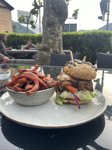 The location is stunning, with its balcony 50m high overlooking the Maggia River next to Ponte Brolla Bridge. The menu of « gourmet burgers » which you could customize to your liking sounded very promising, they even had a Waygu beef option and special red and black burger buns. Without hesitation, all three of us chose their special Waygu beef burger with a wild mushroom sauce and crispy onions on a red bun. We were famished after spending the past 8 hours descending two canyons and were very eager to sink our teeth into this juicy delicacy that was advertised. The restaurant was only half full so we didnât expect a long wait. It took them 20 minutes to take our order, I asked if I could add cheese to mine and was quickly served with a disapproving look advising me not to ruin this delicate meat with a layer of additional fat, feeling rather embarrassed for the suggestion I accepted the waiterâs instructions and reluctantly opted not to take cheese. Twenty thirsty minutes later and we finally had our beers. I must say that the Moretti grand cru ale was rather delicious.