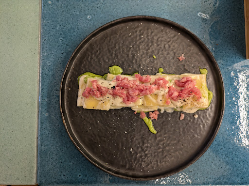 This cozy restaurant offers a refined atmosphere with limited indoor seating and a charming outdoor area overlooking a small plaza, perfect for a quiet meal. We visited on a rainy day and stayed inside, where we enjoyed an exceptional dining experience. The house wine was fruity and delicious, setting the tone for a memorable meal.