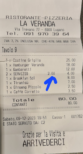 Oltre a questo c'era anche: hamburger 18 CHF piadina gamberetti 12 CHF tiramisù 7 CHF ginseng 2.50 CHF