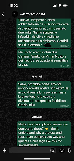 Read moreAt the end of June, three of us had an aperitif at the Vitti restaurant. According to the employee behind the counter, our credit card payment failed. My sister-in-law then paid the same bill with her credit card. Annoyingly, the first payment was also charged to our credit card, so we ended up paying 60 CHF (!) twice. Every attempt to contact the restaurant a few days later (even in Italian) was completely ignored. Incidentally, the WhatsApp number in the screenshot is listed on Vitti's website, and it's a company account. This is a very brazen and rude behavior, which doesn't speak well for the restaurant's professionalism. We now have to go through the hassle of claiming the money via Mastercard, even though the fault wasn't ours, but rather the fault of Vitti's. EDIT: @Ristorante Vitti: Can you tell me the email address somehow? I can’t find it at the website and calling is not the best option because via mail I could send screenshots from the...
