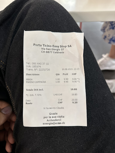 Read moreDopo un lungo viaggio mi fermo in questa stazione di servizio a pochi minuti dall'Italia per pranzare Hanno una vasta scelta di panini , pizza ,pasta ecc Le ragazza mi ha proposto di fare il menù super conveniente bibita caffè insalata e panino tutto compreso a meno di 15 chf Ottima qualità Ambiente spazioso e pulito Personale simpatico e...