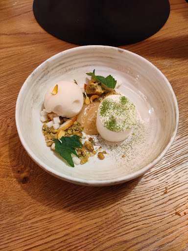 Unica pecca, forse per svista, ma da menzionare, il dessert: il semifreddo pistacchio, pere e zola è accattivante nella descrizione e in generale interessante. Tuttavia l'inserto del semifreddo, ancora congelato, impedisce di gustare il dolce in modo armonioso: se si dovesse aspettare lo scongelamento dell'inserto, la mousse che lo racchiude e il sorbetto di pera che lo accompagna si trasformerebbero in una zuppa. Da rivedere quindi alcuni aspetti tecnici e di servizio, per evitare di rovinare quella che è altrimenti un'esperienza spettacolare.