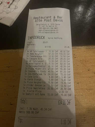 Read moreFor more than 10 years, I described the Alte Post as the Davos go-to for Pizza, Fondue and Italian. Unfortunately the management changed at the end of the 2012 ski season and neither the food nor the service meets the previous standards (tasteless spinach lasagna, luke-warm white wine, indifferent service in the bad). Feb 2013 was my tenth year as a guest, and...