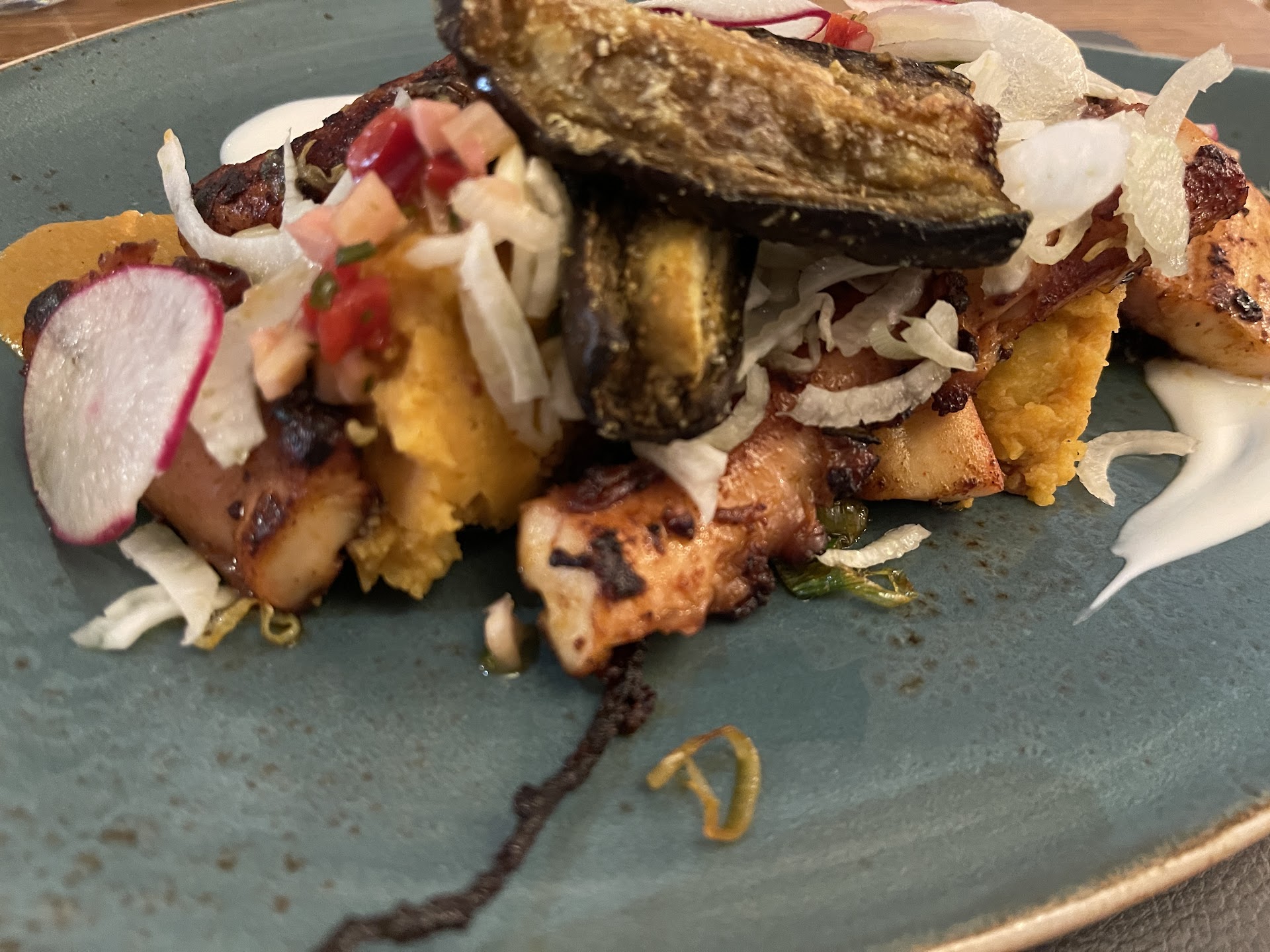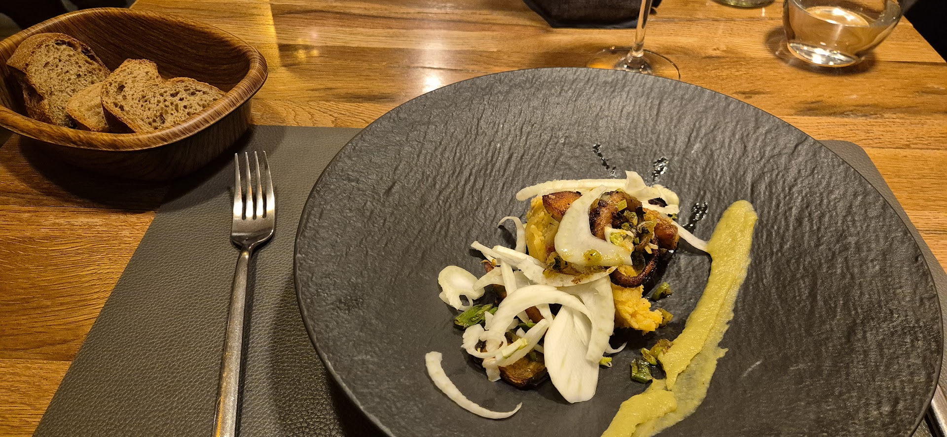 The artichoke scampi amouse bouche was well conceived and could easily be a piece de resistance on its own. The combination if pulpo aubergine, fennel and potato was immaculate. As a main i had the ribeye with seasonal vegetables (the selection and the quality is to die for). Nice sear and fragrant jus. The concept of the peanut brownie with peanut parfait is very unique and is an absolute must to try. The 13 Gault Millau points are an understatement for the Chef and...