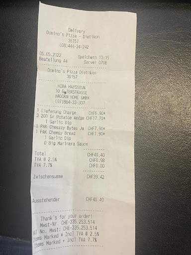 Ich war sehr zufrieden mit dominos und ihre Pizzas, sie waren immer lecker, aber das geschehen das ich jetzt erklĂ€ren werde, hat meine Meinung stark verrĂ€ndert. Ich und meine kollegen haben eine bestellung von 4 pizzas gemacht um 11:20 (Die bestellungsnummer war 15 also macht ich mir keine grosse gedanken), Die bestellung sollte um 12:15 ankommen aber wegen unerklĂ€rten grĂŒnden tauchte der Pizzalieferant nicht auf. Um 12:30 fingen wir an dominos anzurufen, ich habe 2mal angerufen und zwei andere kollegen haben ebenfalls angerufen, keiner nahm den Telefon ab. Wir sind Studenten und hatten eine Mittagspause von 12uhr bis 13uhr. Wir waren nach dem 4en anruf nicht mehr sicher ob wir warten sollteten. Um 12:45 schliessen wir fest das wir keine wahl mehr hatten und wollten die Bestellung abrechen Wir versuchten dominos anzurufen um die bestellung abzubrechen, aber wie gesagt, sie nahmen nicht ab. Um diese Zeit mussten wir in der Schule sein. Ich musste mein telefon auf stumm schalten da wir ein wichtiges Thema hatten. Als Ich wĂ€hrend der Grossen Pause um 14:35 meine benachrichtungen anschaute sah ich das jemand mir um 13:10 angerufen hatte, ausgerechnet wĂ€ren das 55min Unterschied zwischen den Zeitpunkt die wir eingegeben habe. Ich versuchte nochmals anzurufen nachdem ich dies sah aber wieder nahm niemand ab.