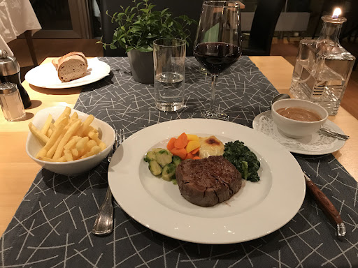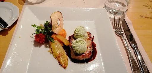 Beim Hauptgang wurde erneut das Besteck vergessen. Auch wenn es schon fast ein runnin gag war, habe ich die Dame erneut um Besteck gebeten (wir erinnern uns an die Forelle) Die Teller standen bereits auf dem Tisch, aber es dauerte etwa zwei Minuten, bis wir auch das Besteck bekamen und essen konnten. Das Fleisch war hervorragend, das GemĂŒsebouquet hingegen eher fade â offenbar im Ofen regeneriert und ohne Butter oder GewĂŒrze auf die Welt gekommen.