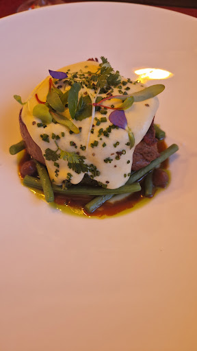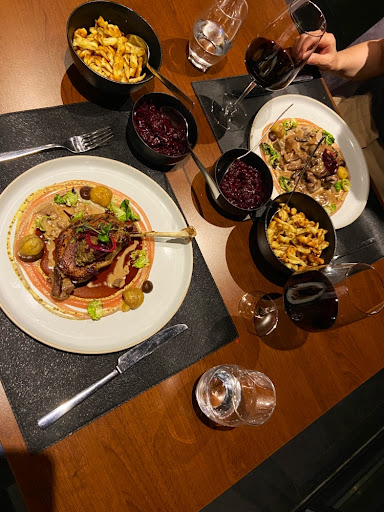 Essen & Getränke ⭐️⭐️⭐️⭐️⭐️ Wir wurden gut beraten und hatten Rehgeschnetzeltes und die Gänsekeule. Das Fleisch war zart, die Beilagen geschmacklich schön aufeinander abgestimmt. Dazu gab es einen schönen Rotwein: DEMUERTE Das Dessert „Beeren“ war sehr leicht auch sehr gut. Jeder Teller war ein kleines Gesamtkunstwerk: Für das Auge und den Gaumen.