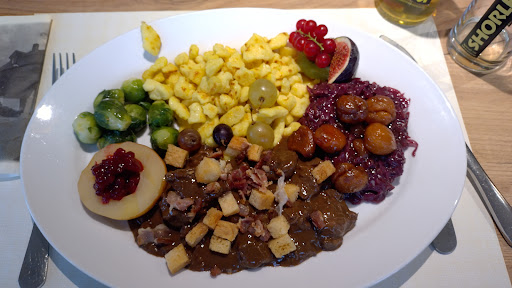 Zu meinem Geburtstag wurde ich zum Essen ins Rössli eingeladen. Auch die Mittags a la carte Karte hat viele feine Speisen zu bieten (ab Freitag 15.9. Wildkarte). Wir haben unIs heute für ein Entrecote mit Kräuterbutter, verschiedenen Gemüsen und Pommes entschieden. Am geschmackvoll dekorierten Tisch hat mir die Chefin Irene einen ihrer Hausaperos, die saisonal verschieden sind, serviert, er hat wie immer ausgezeichnet geschmeckt. Der Hauptgang hat uns sehr überrascht, sah das grosse Entrecote doch aus wie ein Rindsfilet, perfekt gebraten wie gewünscht, war es butterzart und schmeckte auch wie ein Filet. Dazu gab es verschiedene Gemüse, die allesamt ausgezeichnet zubereitet sind. Michi (Chef und Koch) du bist mit Abstand der beste Gemüsekoch weit und breit. Dass die Pommes knusprig und gut gesalzen waren, ist schon fast selbstverständlich. Seit vielen Jahren seid ihr ein absolut verlässliches Team, macht weiter so. Wir kommen gerne...
