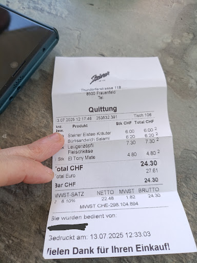 Read moreEine BĂ€ckerei direkt neben dem Kantonsspital Frauenfeld. Die Lage ist gut erreichbar zu Fuss oder mit Velo. Die Parkplatzsituation beim Volg / Steiner BĂ€ckerei ist leider jeweils (vorallem an Feierabenden) extrem ĂŒberfĂŒllt und man findet praktisch keinen Parkplatz. Dies ist aber natĂŒrlich nicht die Schuld des Becks, da gibt es einfach zu wenig Platz. Die BĂ€ckerei ist hĂŒbsch eingerichtet. Es hat genug Sitzmöglichkeiten. Die SitzplĂ€tze aussen sind okay, aber direkt an der Hauptstrasse. Nicht die allerbeste Lage. Die Produkte sind in der Regel immer gut. Es gibt Tage da schwankt die QualitĂ€t ein bisschen. Aber dies ist die Ausnahme. Person ist (in den meisten FĂ€llen) freundlich und zuvorkommend. Preise sind ebenfalls gut. Ab 18 Uhr sind gewisse Speisen aus dem Sortiment 50% reduziert zu erwerben, was ich super finde, da so auch Food-Waste vermieden...