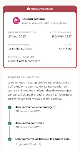 Read moreVous ne pouvez pas Assumez !!!! On peut discuter si vous voulez. J’attends votre retour. comment vous pouvez oser à plusieurs reprise supprimer mon commentaire !!! Je ne comprends pas !!!! Vous avez le droit de ne pas y répondre, mais vous n’avez pas le droit de le supprimer. J’ai acheté 2 paniers TooGood ToGo, le 27.12.23 et le 29.01.24 et 24 heure après mes achats vous les avez annulé. Je n’arrive pas à comprendre pourquoi vous proposez des pannier à vendre et après les transactions vous les annulez. Et je devrais attendre 15 jours pour le remboursement. Ce n’est pas honnête de votre part !!! Soit vous avez vendu mes paniers à d’autres clients en prétendant que c’étaient des produits du jour, soit que vous voulez embêter les gents qui veulent participer au sauvetage de la planète et qui utilise l’application TooGoodToGo. Si vous avez d’autres explications j’aimerais bien les lire sur Avis...