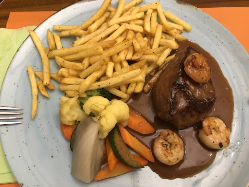 Zum Essen entschied ich mich für ein Surf & Turf: Ein tolles, grosses Stück Rindsfilet, Medium rare gebraten so wie ich es liebe. Raffiniert gewürzt war das Ganze noch dazu. Darauf gab es einen Spiess mit 3 Riesencrevetten im typischen Schmetterlingsschnitt schön auf den Punkt glasig saftig gebraten in einer leckeren, Knoblauchdominanten Würze. Alles in einer kräftigen Pfeffersauce, die mit Sicherheit von Grund auf selbst gemacht ist. Die Sauce enthielt relativ viele Pfefferkörner, diese waren aber eher mild, sodass das Gesamtpaket wieder perfekt harmoniert hat. Ein wenig knackiges Gemüse (Karotte, Sellerie, Blumenkohl & Brokkoli), leicht mit Salz abgeschmeckt gab es auf der Seite zusammen mit fantastisch gewürzten Pommes-Frites. Im Vergleich zu früheren Bildern war das Gericht heute nochmal um ein Vielfaches aufgewertet. Zum Dessert gab es ein frisches, hausgemachtes Erdbeermousse mit Erdbeersauce und Rahm. Ein feines Spiel zwischen Süsse und Säure zum Abschluss - luftig und leicht!