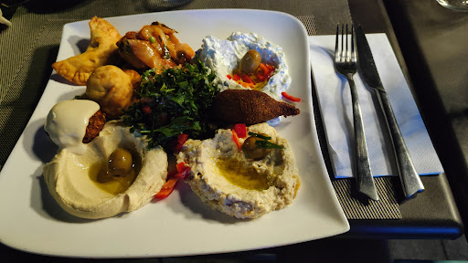 We were three people and had the mezze selection — around 6 to 8 traditional Lebanese dishes. Everything was absolutely delicious: hummus, tabbouleh, falafel, stuffed vine leaves, labneh, and more. We also enjoyed both hot and cold mint tea, which paired perfectly with the meal. For dessert, we had a creamy pudding topped with crushed pistachios — just amazing.