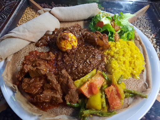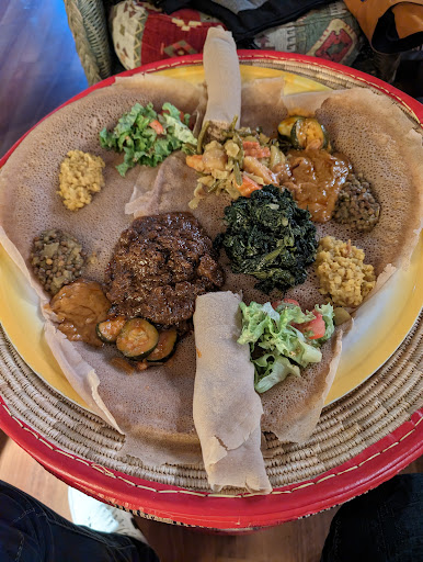 Ethiopian food is one of my wife and my favorite foods to eat out. This was our first time at this restaurant and we arrived right as it was opening for the evening. The decor as shown in my pictures and referenced by many reviews was one of the best I have seen in an Ethiopian restaurant. We used a BuyClub voucher which was a great deal that included a half bottle of wine, appetizer and three meat dishes. That said the food was just average. The injera was cold as if coming from the refrigerator and was very dry and easily fell apart. The meat dishes were pretty good but the vegetarian dishes usually our favorite were almost without flavor. I gave it three stars due to the friendly wait staff...