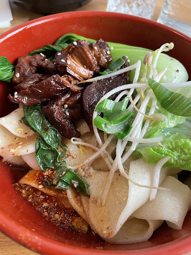 Bon bah en vrai que puis je dire ? Moi je ne connaissais pas les nouilles Biang Biang. Hé bah je peux vous dire que c'est quelque chose. Si vous cherchez une explosion de saveurs dans la palet (qui deviens un palais) bah c'est la bonne adresse en fait. J'habite juste à côté, et j'ai tout fait dans les grottes hein, le Reaun Thai, le Quai, Le nomad, le lexique... Je vais te dire Rissa (la propriétaire/cuisinière/aventurière avec plein d'anecdote à vous raconter...) Tu rentres direct dans le Top 2 des meilleurs restaurants dans les grottes (faut pas déconner le Kozan reste mon restaurant préféré à Genève...) mais franchement allez y les yeux fermé. C'est généreux, végétarien, riche et exotique (ya de la viande aussi mais franchement pas besoin). Une danse des saveurs. La déco est sympa à l'image de ce beau quartier on se sent chez soi, c'est jeune dynamique et inclusif. Je pense que à Genève on paye toujours trois fois trop chère les bols de ramen, j'avais peur que ce soit le cas avec le biang biang qui de premier abord, peuvent etre de produit comparable. Mais en fait c'est tellement bon, tellement explosif en termes de saveurs que bon, 25 francs le bol c'est carrément honnête. Dites lui Marraming Saramat (désolé pour l'orthographe) elle...