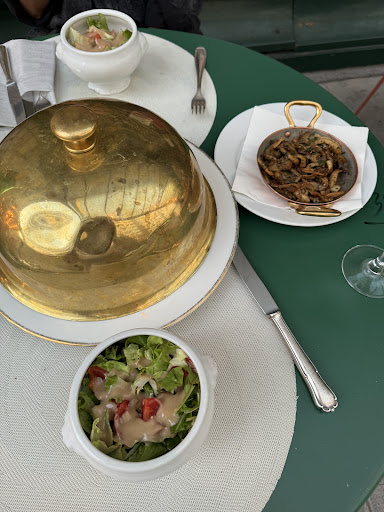 The meal starts with a free mini salade and, in our case, a delicious purée de pommes de terre à la truffe that we ordered (potato purée with truffles). The service is efficient, and the outdoor seating is pleasant.