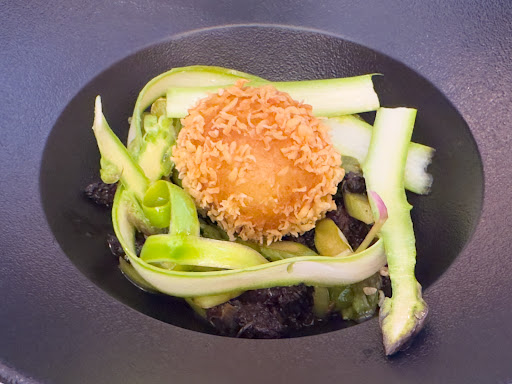 I had the soft-boiled crispy egg with morels and green asparagus in a jus. The dish was flavorful, the egg perfectly mollet, and everything blended harmoniously—not overly salty, which I appreciated.