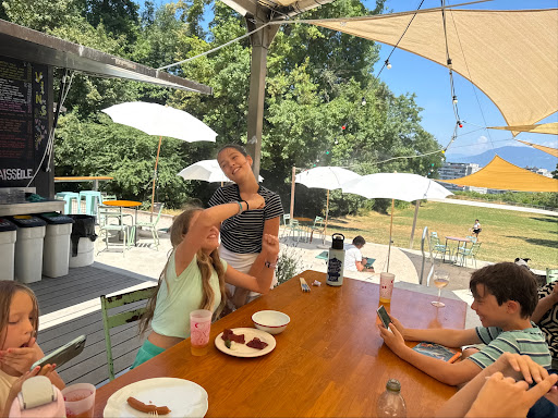 A lovely spot inside Parc de la Bâtie where you can enjoy drinks and light snacks while taking in the surroundings. The park itself is beautiful, leading down to the junction of the Rhône and Arve rivers, with plenty of activities including a large playground for children and even a small animal park higher up.