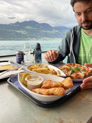 The Seegarten Restaurant is right on the lake and probably the best place to eat in Gersau. Prices are quite reasonable and service is always good. We had the large pizzas 40cm and took a few leftover slices in a doggy bag back home. The pizza is baked in their own open fire oven so it tastes delicious. Reserve seats on the terrace ahead of time if you can for groups with more than 4 people because the outdoor seating can be limited when the sun is shining. We got lucky this time because a couple just finished eating at 1pm and the pizza oven closes at 2pm. I highly recommend this place anytime for a beer, coffee or desert because, the view is awesome and you can watch the big boats...