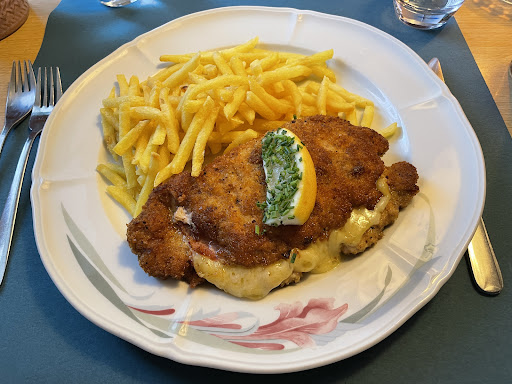 We very much enjoyed the cordon bleu at the Gasthaus Rössli. They have a whole menu page dedicated to cordon bleu variations, but we chose the classic ham and cheese version (Hundsgwöhnlech). The cordon bleu came out perfectly fried, crispy on the outside and flavorful on the inside. Also, the tagliatelle with fresh porcini mushrooms (Steinpilzen) dish was nice. We ordered an asparagus soup, the Solothurn white wine soup (Solothurner "Wysswii-Suppe"), and a green salad as well. The only thing we did not like was the Solothurn white wine soup, which was too salty. Everything else was good. The service was helpful and...