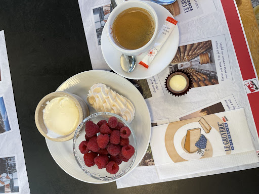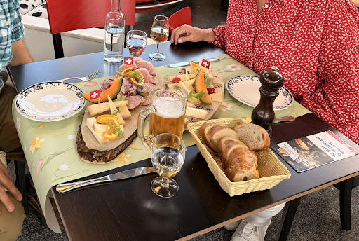 Paulo served us a fabulous lunch (a cheese board and a meat board with wine and beer) accompanied with enthusiastic information about the various cheeses and their origins, as well as introducing us to the local dessert specialty of double creme and meringue, which was magical! He offered us a box for the plentiful leftovers as he suggested we explore the town of Gruyères' other offerings. It is rare to find a restaurant server who truly enjoys his job enough to engage so positively with his customers. From suggesting items on the menu to explaining them when delivered, it really was an enjoyable experience. And we observed that he was the same with his other customers, without it slowing or inhibiting his performance. The restaurant was clean, efficient, and all of the items we saw served around us were very appetizing-we wished we could have stayed in the area longer to try more of the food! After visiting the historic town and castle for the afternoon, as well as the museums he recommended, we returned for coffee and dessert. We were served by Vivianne(?) who was equally helpful, recommending and explaining a local dessert that included a pear tart.