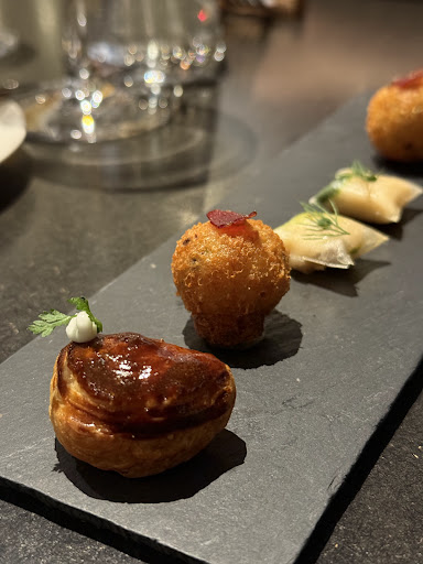 Read moreUma ótima descoberta! O jantar foi ótimo, num lugar bastante charmoso e com uma equipe muito simpática. Eles oferecerem a possibilidade de escolha de uma experiência com 4, 5, 6 ou 7 tempos/pratos. Como petisco, tinha um malakoff recheado com queijo, uma bolinha de carne de porco e um travesseiro de salmão defumado com espinafre. A entradinha proposta foi uma cebola com um caldo trabalhado com alecrim, também experimentamos um gravlax, não de salmão, mas de carne bovina com um molho de gergelim. Estava simplesmente incrível! O menu segue com o peixe dos lagos suíços: o fera; e depois com a galinha de capoeira da região de Gruyère e trufas. Neste momento, você percebe que o jantar está próximo do fim e dá vontade de recomeçar, porque os pratos são muito gostosos e bem trabalhados. Antes da sobremesa, pudemos degustar uma iguaria do Piemonte: avelãs, chocolate e peras (eles são muito engraçados com os nomes, porque você sabe o que comerá, mas de um jeito lúdico e criativo, assim como o menu). Para não estragar a surpresa, não vou dizer o que foi apresentado como sobremesa, mas ela se chama “quem roubou a laranja do comerciante”? Você é convidado a abri-la com a colher e descobrir o que tem lá dentro. Eles oferecem uma opção de harmonização dos pratos com os vinhos bastante interessante. A cada mudança do cardápio, uma nova vinícola é escolhida para a harmonização. Acho que este é um ponto menos interessante para aqueles que amam descobrir novos produtores de vinhos, porque eles se restringem a apenas uma adega. Voltarei outras vezes com toda a certeza. Parabéns ao chefe Villaret e seus cozinheiros, bem como à...