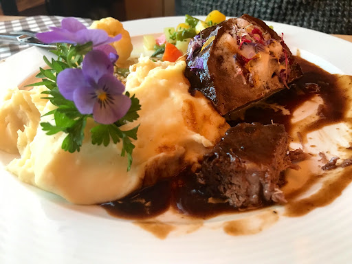 I was glad we found such a Swiss restaurant which does Not have cheese fondue on their menu but delicious local farmer’s recipes! Ordered a farmer’s steak and a mixed salad with sausage. The steak which was unbelievably tender and had abundant flavour. The sauce is no ordinary steak gravy but must be a secret recipe! I’m not a steak lover but after tasting a few bites from my partner’s plate, I decided to come back for this steak! The mixed salad with sausage is made of fresh vegetables which must have been marinated in vinegar and herbs by the restaurant as the veg was crispy and maintained original fragrant of veg. A great choice for a light diner. The restaurant is accessible only by foot as driving is not allowed on the road to the restaurant. The nearest parking is about 30 minutes walk away. The restaurant is located in the foot of picturesque mountains, peaceful and whispering quite.