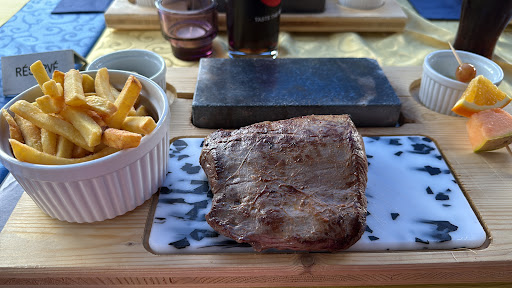 It is up to the diner to cut the meat as he or she wants and put it on a very hot stone to cook further.