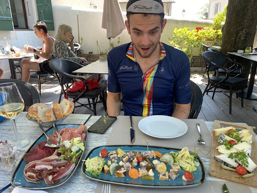 The kitchen was apparently closed, but they turned out the most amazing charcuterie board (three boards) of meat, terrines & salad and cheese. We were blown away. Helped a little old lady with phone network issues so she bought us an icecream and a coffee to say thank you. The staff suggested we have them together as an affogato with coffee ice cream and chantilie on top.