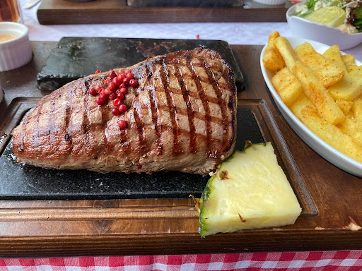 Ā Ā Ā Read moreOnce more one of the best restaurants I have been where the meat comes on a hot stone. As a appetizer we had onion rings and shrimp cocktail which both of them were very well prepared. Nicely decorated and very tasty. The 300g Ranger meat was so juicy and a extremly well cut piece of meat. It tastes extremly delicious accompanied with house fries and three sauces. The garlic sauce is my favourite. However when we asked for the bill we nearly had to wait 20 minutes. The restaurant was very busy but telling that we want to pay to three different service staff was ro much. Therefore I can only give four stars. I hope the next time I come back the bill will come quicker. Highly recommanded and if you are really lucky rolli visits the restaurant. He is a really nice person with a...
