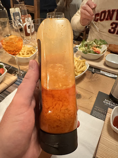 The restaurant used to be alright, but the new concept is subpar. Admittedly, the service is friendly (although not everybody speaks the local language like, but ok). The concept of having to order online and having to provide an email address is strange and not very personal. Nor do the canteen like carts help the impersonal impression. The food itself earns the distinction of being the worst cordon Bleu I ever had and the worst meal in Films / Laax. Salad with barely any dressing and mass food. The cordon bleu itself was of atrocious meat quality, dry, small and the “goat cheese” was anything but that. Just bad. Not as bad as the sauces provided, for which the picture below...