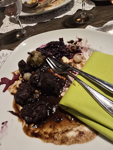 Meine Kollegen hatten beide ein Stroganoff mit Rindsfleisch. Die Sauce hatte Geschmack nach Paprikapulver als würde ich mir das Pulver direkt auf die Zunge streuen. Sehr unlecker für diesen Preis.