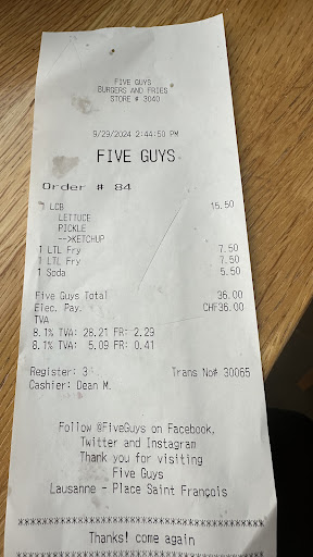 In short, this is the first and last time we ate at Five Guys Lausanne, or Five Guys in general. This was a disappointing experience, unfortunately. Luckily, we have better choices in Lausanne such as Holy Cow or Zoo Burger, where value for money definitely are in a better equilibrium.