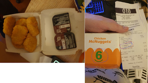 Après réception des menus et muni de mon ticket, je retourne au comptoir aviser gentiment un membre du personnel (qui se trouve être le responsable) qu’il manque une sauce cocktail, ce à quoi on me répond que non. J’insiste en assurant ne pas l’avoir reçue et invite le « responsable » à venir vérifier. Il finit par m’en donner une, avec mes remerciements.