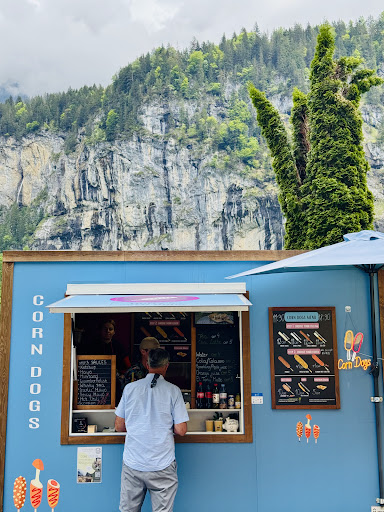Betty's Corn Dogs is such a wonderful little find in Lauterbrunnen, serving up a unique Swiss twist on corn dogs, complete with delicious Swiss cheese! We loved their fun and easy three-step customization process: first, you choose your filling (we really appreciated the vegetarian option!), then select your 'cover' (we picked the potato fries cover!), and finally, pick your sauce to enjoy (we went with ketchup and relish sauce!). The staff were very friendly. They were quite busy when we visited, so there was a slight wait, but it wasn't too long at all. It's good to know there's no dedicated seating, just a few umbrellas and some planters people were using to lean against, so it's more of a grab-and-go experience. A delightful and tasty...