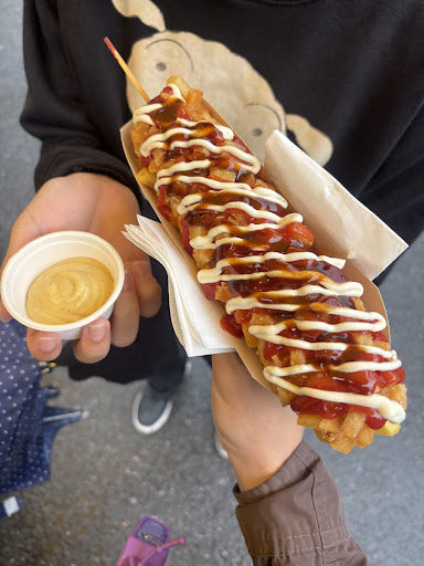 Read moreAmazing corn dog. Normally a corn dog is too doughy and dense and the meat inside is dry. But this wasnt. It was moist and light and airy and great. Not your conventional swiss food, but great nonetheless. We had the pork sausage and cheese covered in potato fries drizzled with garlic mayo, whiskey bbq and ketchup. Cucumber relish on the side (dont really need to get that). Potato coating was so nice and crispy and tasty, and the cheese was just amazing. Who doesnt love melted cheese and a corndog coating with fries? The sausage was probably not as heavy, but still pretty good. I would argue this is one of the better tasting stuff u can get here.