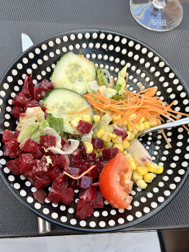 Pour ma part, j'ai pris une salade grecque pour 25 fr, mais même pas capable de prendre des légumes frais au marché et de les laver. Les betteraves étaient dégueulasses, avec une odeur affreuse. Bref, la seule chose qui était bonne, c'était la pizza et le gigot d'agneau à part les légumes congelés, tout était mauvais.