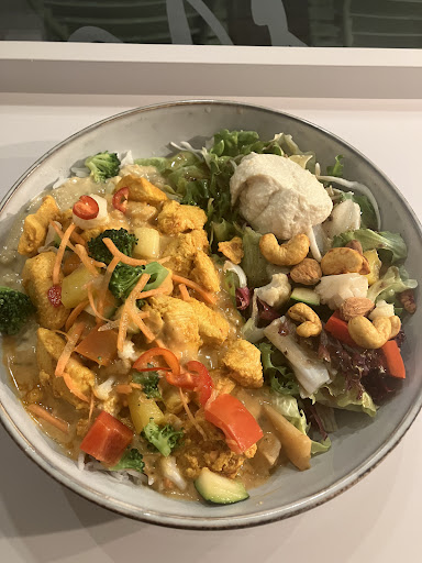 Read moreIt’s one of those few modest places which fills you with positive vibes. The interiors are pleasantly soothing, comfortable dining tables, well lit space. Coming to the business- I had a chicken curry - which was served in a bowl. It came with rice, hummus, salad and yogurt. The food was sumptuous and delicious. Chicken was was well cooked and curry was going easy on your taste palate. Hummus was super delicious. I really liked that they had added few cashews and almonds in the dish which gave a fantastic crunch to every bite. Quantity and quality both were excellent. I really loved this place. Would certainly love to...