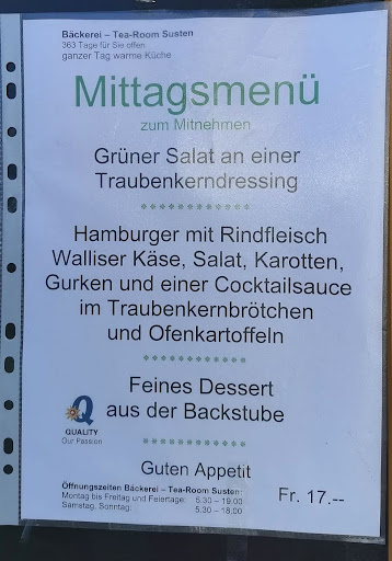 I normally buy grape flour pastries here. But recently, the bakery has started to offer a take away menu once a week - always on Tuesdays. Today I decided to try. The take away menu includes a salad, main course and dessert. All for CHF 17.- I must say that the burger was really tasty as well as the roasted potatoes. Unfortunately, nowhere was a notification about, that the salad and cocoa biscuit contain nuts. This wasn't communicated to me when I took the menu either. However, as an allergy sufferer, this is vital information for me! Because of this, I deduct one star...