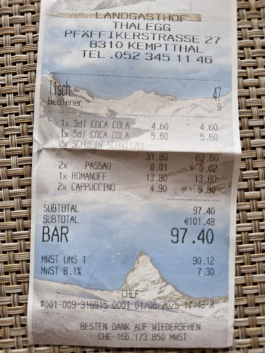 Es ging gegen 18.00 Uhr zu. Der Wetterbericht meldete ab diesem Zeitpunkt Regen und lokale Gewitter. Da würde man dann auf dem Töff schon lieber die Heimreise antreten, als 40 Minuten darauf zu warten, endlich bezahlen zu können. Die Rechnung kam. Total CHF 97.40. Darauf notiert der retournierte «Coupe Romanoff» zu CHF 13.80. Entschuldigung? Eine Kugel Vanille/Erdbeer ohne Rahm kosten demzufolge CHF 13.80? Nicht doch!