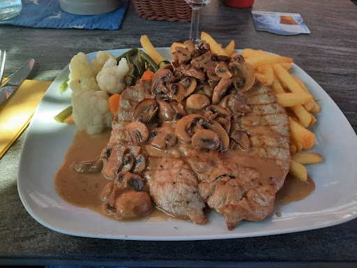 Die Bedienung war freundlich und fix. Das Essen gut. Zweimal panierte Schnitzel vom Schwein Passau, mit Champignon-Rahm-Sauce, Pommes und Gemüse.