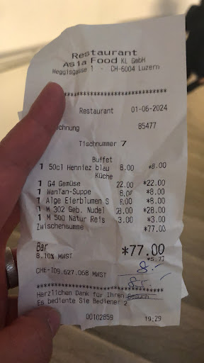 Read moreBeware and stay away. Right from the beginning the experience was unpleasant. The boss was unfriendly with arrogant attitude and vibes. The beef hor fun was oily and overpriced, the portions were small . 1 bowl of seaweed soup costs 8chf. ( see picture ) Worst of all, the boss wrote himself a tip at tip column but I still paid and didn’t kick up a fuss because I was with my young child and guests who are visiting Switzerland for the first time. He is very dishonest because tipping is not compulsory but we do tip generally for good service. For such experience he doesn’t deserve the tips. I wonder how this restaurant has been getting away for such dishonesty for so long perhaps prying on unknowing tourists. I won’t recommend this place nor come back ever.