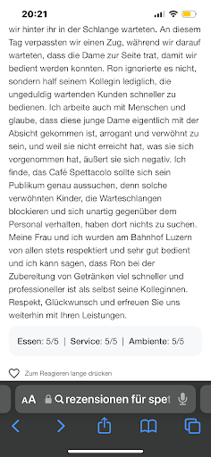 Abschliessend möchte ich betonen, dass es bei Spettacolo auch sehr positive Erfahrungen gibt: Zwei langjährige Mitarbeiterinnen, die nur früh morgens arbeiten, machen ihre Arbeit hervorragend, sind sehr freundlich und professionell. Sie wären meiner Meinung nach sehr geeignet, auch in einer verantwortungsvolleren Position wie der stellvertretenden Geschäftsführung zu arbeiten. Ihr Umgang mit Kunden ist vorbildlich und trägt deutlich zum guten Ruf des Cafés bei.