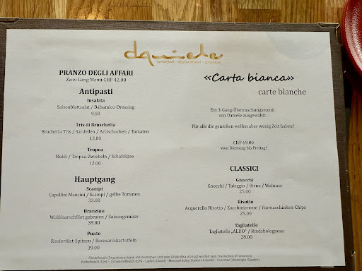 Read moreIch darf seit geraumer Zeit gelegentlich Gast von Daniele’s Restaurant sein. In all den Jahren haben sich verschiedene Küchenchefs abgewechselt. Beeindruckend ist jedoch, dass die Qualität der Speisen stets auf höchsten Niveau blieb. Genau hier kommt vermutlich der Chef selber zur Geltung. Seine Kompetenz bei der Wahl der Rohstoffe und sein Qualitätsverständnis führen dazu, dass die Calamari fritti wie beispielsweise in Gallipoli, die Miesmuscheln ähnlich wie in Amalfi oder die Tonnarelli cacio e pepe wie in Trastevere schmecken. Die Perfektion der Gerichte sucht nicht nur in Luzern sondern weit über die Stadtgrenzen hinaus ihresgleichen. Weinseitig kommen vom Einsteiger bis zum anspruchsvollen Profi alle auf ihre Kosten. Reicht doch das Angebot vom slowenischen Geheimtipp bis zum grossen, weltbekannten Toskanischen- oder Piemontesischen-Wein. Die Möglichkeit, auch grosse Etiketten im Offenausschank geniessen zu können, ist einmalig. Der Zigarren-Aficionado findet in der eleganten Lounge ein erlesenes Sortiment an Zigarren und passenden Spirituosen. Sei es zum Mittag-, zum Nachtessen, zum Apéro oder auch nur zum Espresso zwischendurch, übrigens der mit an Sicherheit grenzender Wahrscheinlichkeit der Beste der Stadt Luzern, wird man beim Besuch im Daniele’s Restaurant...