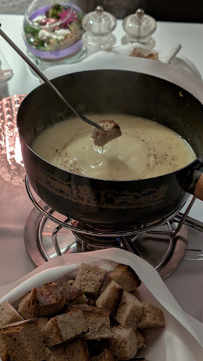 Secondly, the food is way too overpriced and disgusting. Not sure if authentic cheese fondue is supposed to be like this but it was vile and pungent. The cheese was really bitter too. The bread was terrible too. I have no idea how bread could be screwed up that bad. They gave a pitiful amount of bread too for the price.